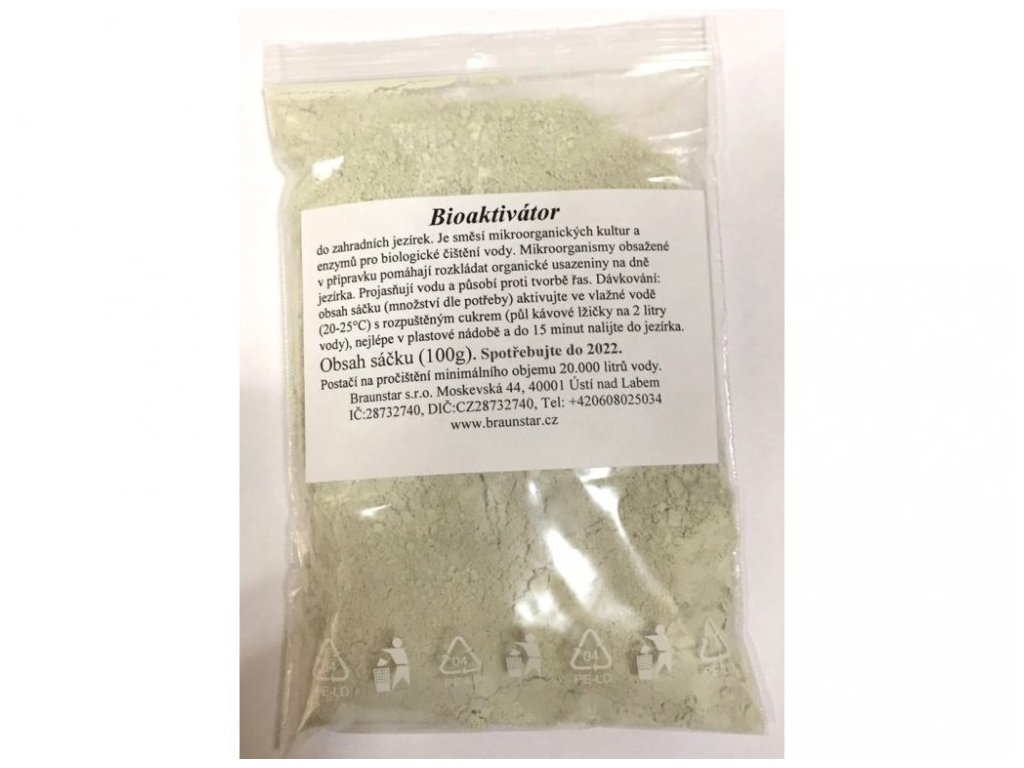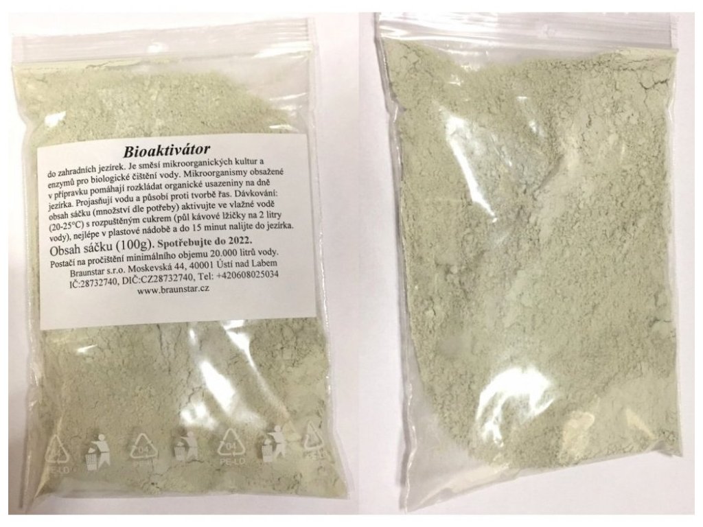 - Nejlépe je rozložit dávkování na 2 až 3 dávky po několika dnech. Obsah sáčku (množství dle potřeby) aktivujte v cca 3-5 litrech vody nabrané z jezírka do plastové nádoby, a do 15 minut roztok nalijte do jezírka.